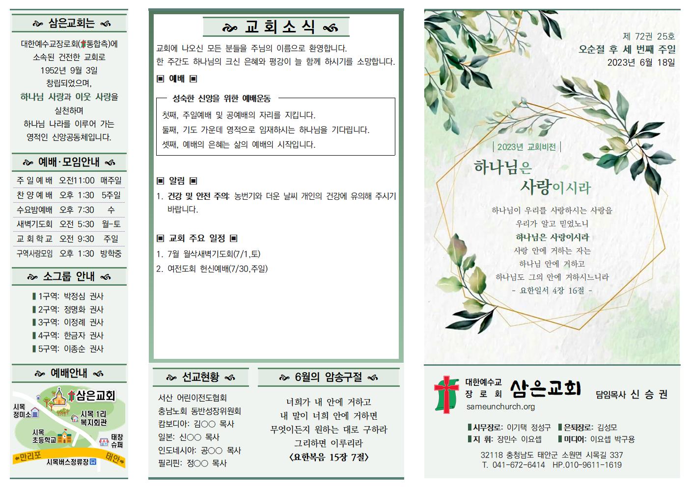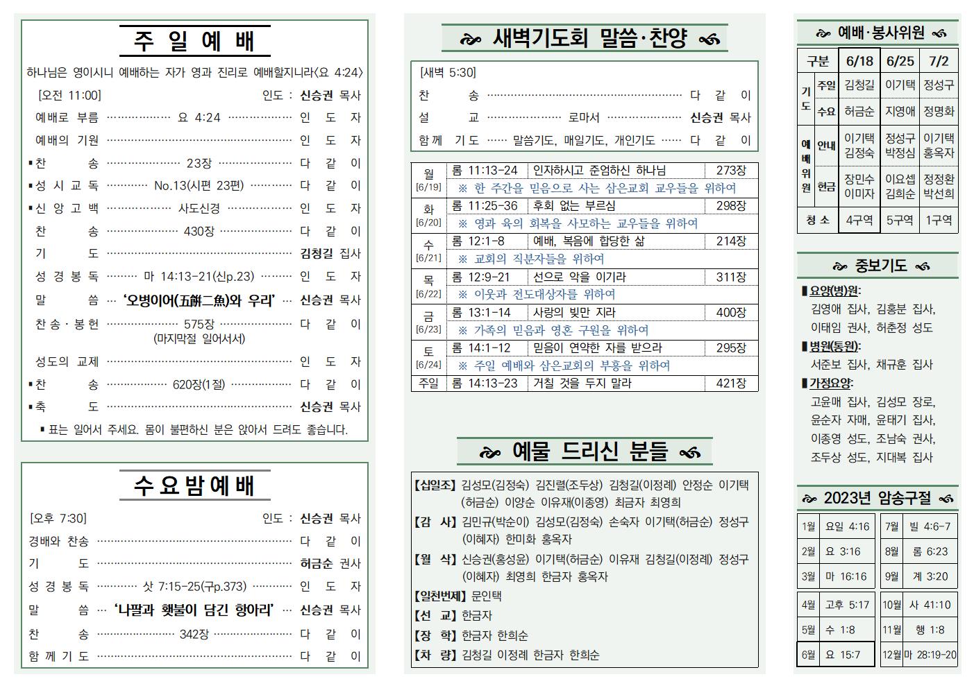 나눔, 소식과 앨범/주보 23.06.18 신승권 목사 2023. 6. 21. 10:31 공유하기 게시글 관리 삼은교회 '나눔, 소식과 앨범 > 주보' 카테고리의 다른 글 23.07.02 (0) 2023.07.04 23.06.25 (0) 2023.07.04 230611 (0) 2023.06.10 230604 (0) 2023.06.03 230528 (0) 2023.06.03 '나눔, 소식과 앨범/주보' Related Articles 23.07.02 23.06.25 230611 230604
